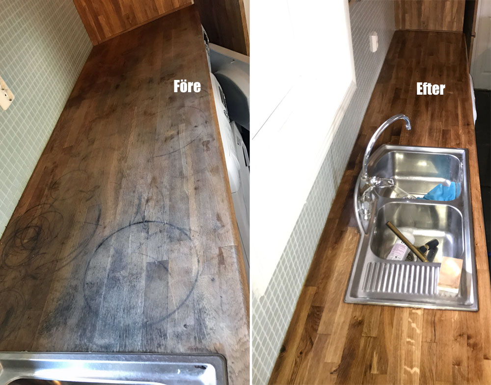 Vänner! Vi utförde en flyttstädning och vi upptäckte att bänkskivan i köket såg katastrofal ut, dock inte längre :-). Vi åtgärdade detta
