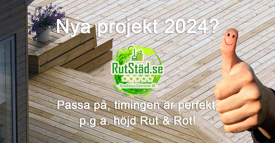 Vänner! Nytt år - nya projekt! 2024 är äntligen här! Både ROT och RUT höjs med 25.000 kronor vardera!!! Detta är ju kanonbra för alla, som t.ex. vill bygga altan och renovera. För dig som planerar är timingen perfekt- nytt år, nya rotavdrag, i år med dubbel bemärkelse: Både ROT och RUT höjs alltså med 25.000 kronor, så låt ej pengarna "brinna inne". - Vad vill du satsa på?